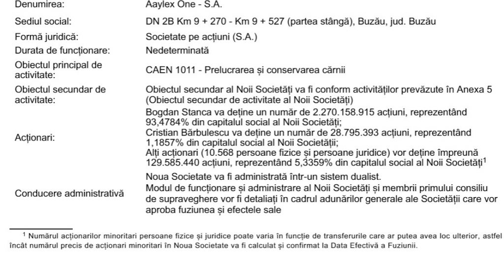 Transmiterea universală a patrimoniului fiecărei societăţi dintre cele 16 enumerate mai sus către societatea nou-creată Aaylex One SA care va prelua activul şi datoriile celor 16 firme implicate în fuziune.