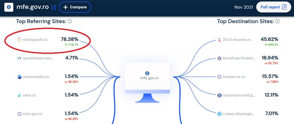 Circa 4% dintre vizitele pe site-ul oficial mfe.gov.ro au provenit de pe alte site-uri, care au pus link-uri către MIPE (conform datelor de pe desktop). Pe primul loc între site-urile de referință care au trimis vizitatori la MIPE a fost StartupCafe.ro, publicația noastră de antreprenoriat. StartupCafe.ro a furnizat 78% din traficul primit de MIPE de la site-uri de referință.