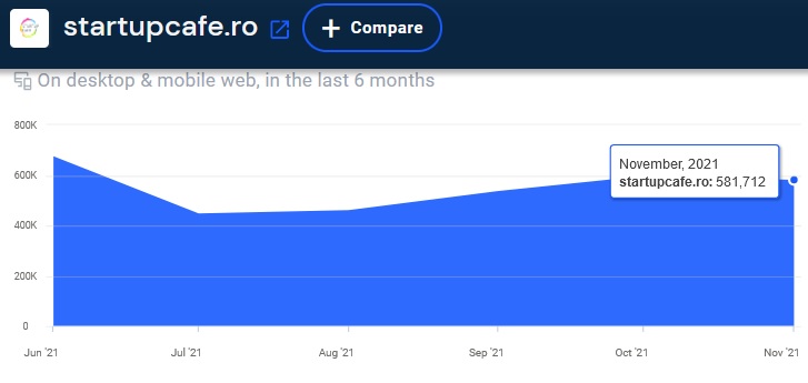 În luna noiembrie 2021, StartupCafe.ro a primit 581.712 vizite, în scădere cu 16.000 de vizite comparativ cu octombrie, potrivit Similar Web.
