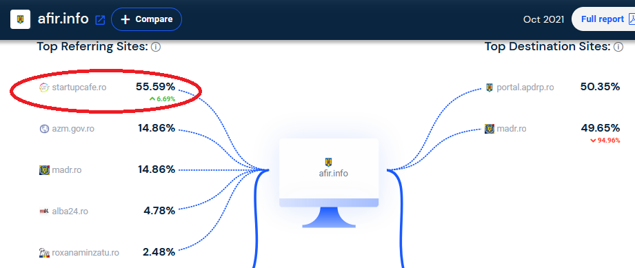 Și site-ul Ministerului Investițiilor și Proiectelor Europene (mfe.gov.ro) a avut trafic măricel în luna octombrie 2021, conform datelor de pe Similar Web. Circa 85.000 de vizite a primit site-ul MIPE în octombrie, totuși în scădere față de luna septembrie, cu 3,7%. Aici traficul din referrals a fost de 2,88% din vizitele primite de portalul mfe.gov.ro de pe calculatoare. Și pentru MIPE, tot StartupCafe.ro a fost site-ul de referință numărul unu: cu un procentaj de 51,76% din tot traficul primit de mfe.gov.ro de la diverse site-uri (pe desktop).