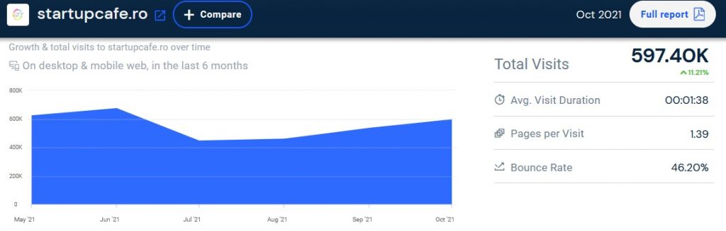 În octombrie 2021, StartupCafe.ro a primit aproape 600.000 de vizite, de pe desktop și dispozitive mobile, cu 11% mai multe decât în septembrie, conform analizei Similar Web.