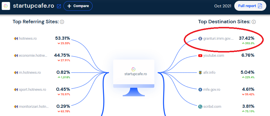 Dacă ne uităm și pe traficul de pe StartupCafe.ro, în luna octombrie 2021, site-ul către care am trimis cei mai mulți vizitatori a fost portalul de Granturi IMM (granturi.imm.gov.ro). 37,42% dintre vizitatorii îndrumați de StartupCafe.ro către diverse site-uri au ajuns la portalul oficial al măsurilor gestionate de Ministerul Economiei pentru finanțarea firmelor.