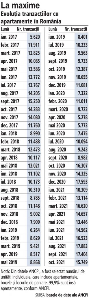 „Referitor la statistica privind tranzacţiile cu UI (Unităţi Individuale), precizăm că la această rubrică sunt cuprinse imobile tip apartament, boxă, locuri de parcare. Mai precizăm că 99,9% sunt apartamente“, au spus reprezentanţii serviciului de comunicare al Agenţiei Naţionale de Cadastru şi Publicitate Imobiliară. Datele relevă că, din octombrie 2020 încoace, numărul tranzacţiilor cu apartamente nu a mai scăzut sub 10.000, aşa cum se întâmpla în anii trecuţi în unele luni. Aprilie 2020 a venit cu o scădere puternică, până la mai puţin de 5.300, sub şocul generat de pandemie, pentru ca, opt luni mai târziu, acest indicator să ajungă la un nou maxim, depăşind pragul de 17.000 de contracte de vânzare-cumpărare semnate.