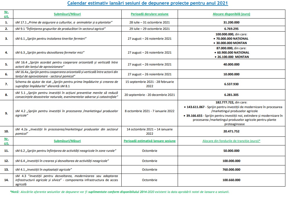 Submăsura 6.2 – Sprijin pentru înfiinţarea de activităţi neagricole în zone rurale – octombrie 2021. Buget: 50 milioane euro. Ajutorul public nerambursabil va fi de 50.000 de euro/ proiect, cu excepția activităţilor de producţie pentru care valoarea sprijinului este de 70.000 euro/ proiect. Sprijinul se acordă sub formă de sumă forfetară în funcție de tipul investiției, respectiv, 50.000 euro sau 70.000 euro. Nu se alocă sume intermediare.Grila de punctaj favorizează cabinetele medicale, afacerile din producție și antreprenorii în IT. De asemenea, pe zona de servicii, deși sunt excluse de la finanțare pensiunile noi, vor fi favorizate afacerile în agrement și alimentație publică, în zonele cu potențial turistic ridicat.