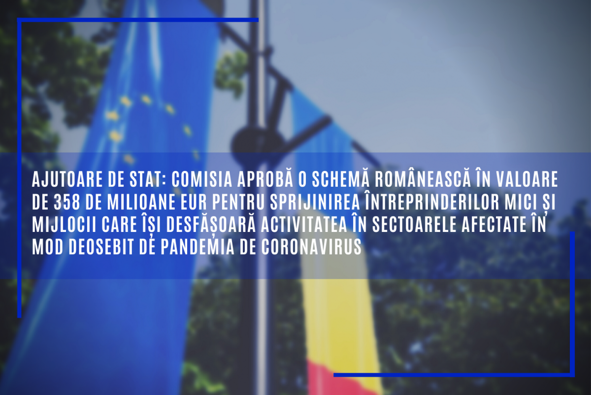 Comisia Europeană a aprobat o schemă românească în valoare de 358 de milioane EUR (1,772 miliarde RON) pentru a sprijini întreprinderile mici și mijlocii (IMM-urile) afectate de pandemia de coronavirus și de măsurile restrictive pe care guvernul român a trebuit să le pună în aplicare pentru a limita răspândirea virusului.
