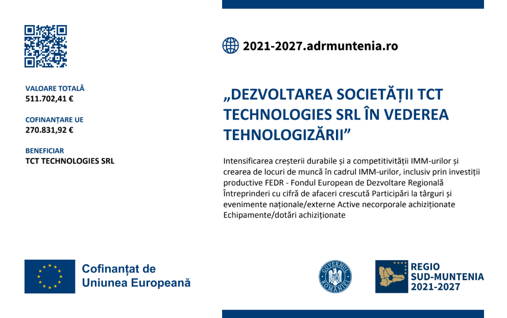 Societatea TCT TECHNOLOGIES S.R.L. anunță lansarea proiectului cu titlul „Dezvoltarea societății TCT TECHNOLOGIES SRL în vederea tehnologizării”, cod SMIS 332596, finanțat prin Programul Regional Sud-Muntenia 2021-2027, Prioritatea „O regiune competitivă prin inovare, digitalizare și întreprinderi dinamice”, Obiectiv specific RSO1.3 – Intensificarea creșterii durabile și a competitivității IMM-urilor și crearea de locuri de muncă în cadrul IMM-urilor, inclusiv prin investiții productive. Proiectul are o perioadă de implementare între 29.09.2025 și 29.09.2026 și se desfășoară la punctul de lucru al societății din Ploiești, str. Tunari nr. 1A, Depozit 1, camera 3, județul Prahova. Obiectivul general al proiectului constă în intensificarea creșterii sustenabile și a competitivității societății TCT TECHNOLOGIES S.R.L. prin crearea de locuri de muncă și realizarea de investiții productive. Obiective specifice: