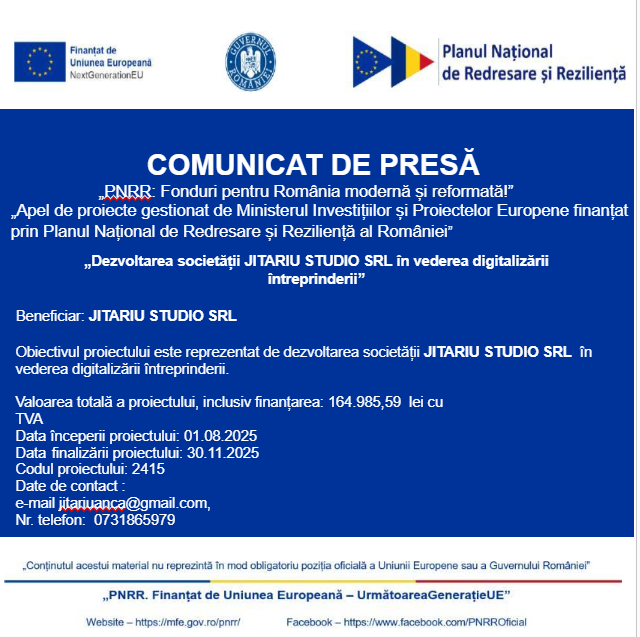 „Dezvoltarea societății JITARIU STUDIO SRL în vederea digitalizării întreprinderii”