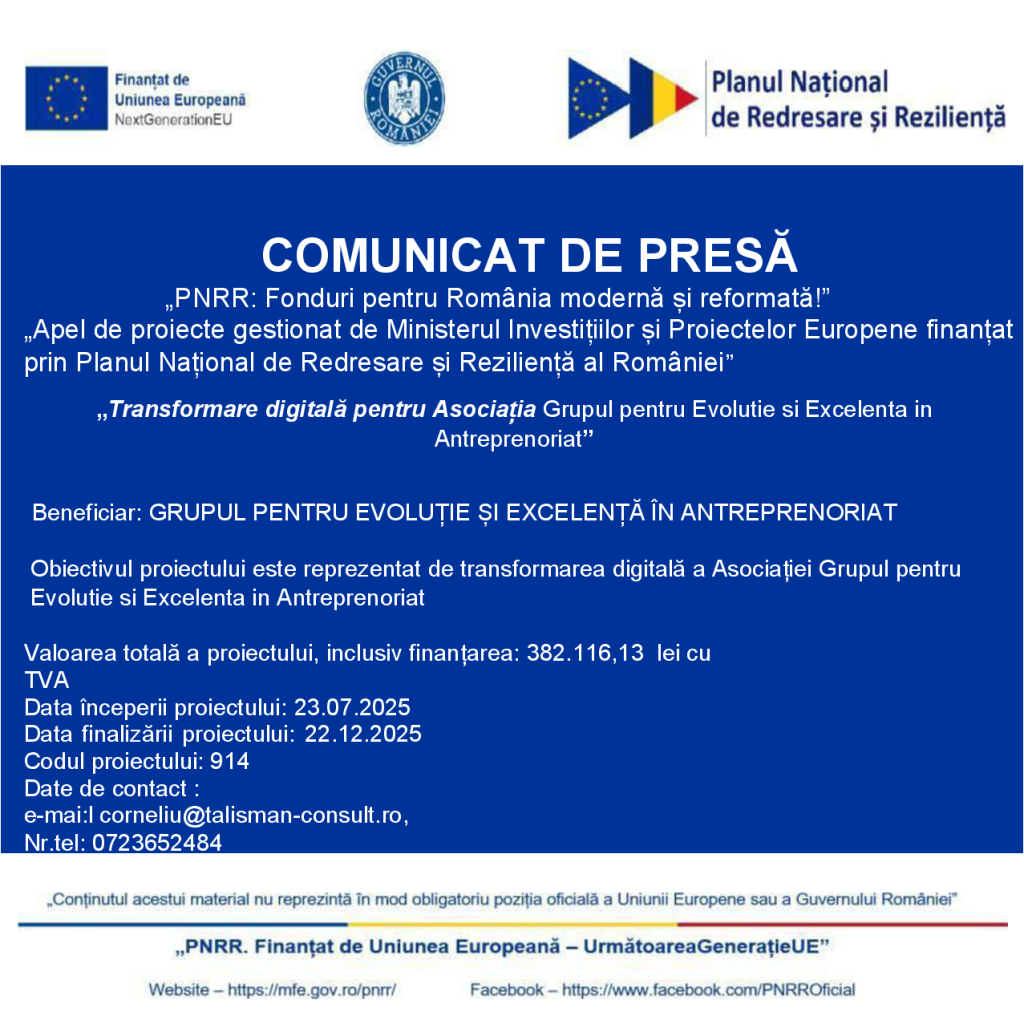 COMUNICAT DE PRESĂ –„Transformare digitală pentru Asociația Grupul pentru Evolutie si Excelenta in Antreprenoriat”