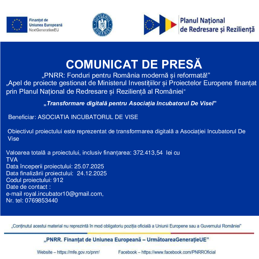 COMUNICAT DE PRESĂ „PNRR: Fonduri pentru România modernă și reformată!” „Apel de proiecte gestionat de Ministerul Investițiilor și Proiectelor Europene finanțat prin Planul Național de Redresare și Reziliență al României” „Transformare digitală pentru Asociația Incubatorul De Vise I”