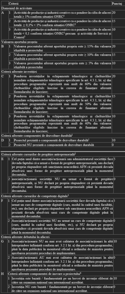 – punctajul obtinut la criteriul aferent debutului în afaceri (sectiunea G din criteriile de evaluare);