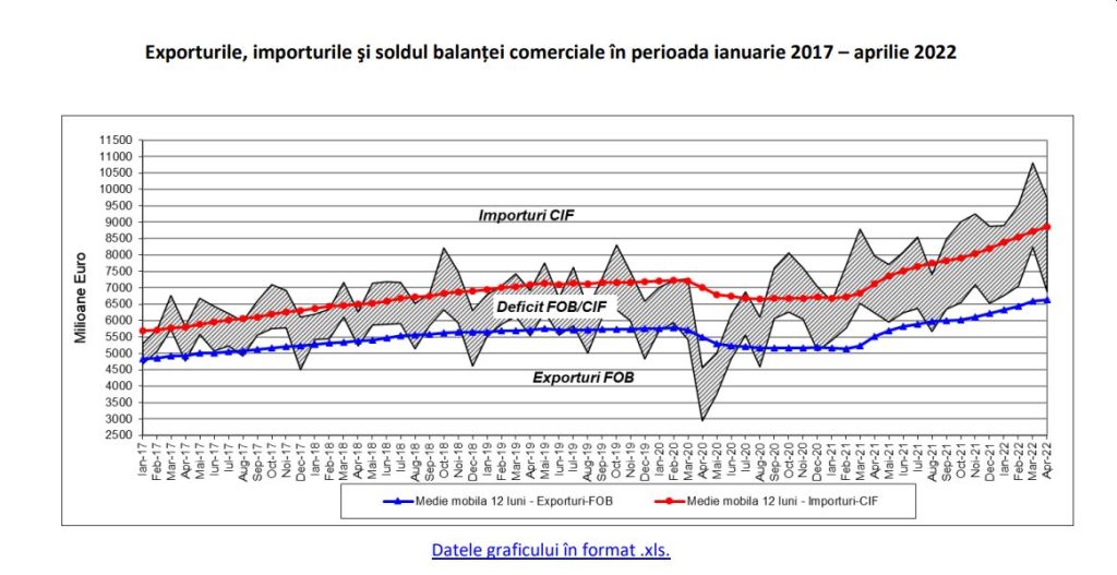 În luna aprilie 2022, exporturile FOB au însumat 6,886 miliarde de euro, iar importurile CIF au însumat 9,711 miliarde de euro, rezultând un deficit de 2,824 miliarde de euro. Faţă de luna aprilie 2021, exporturile din luna aprilie 2022 au crescut cu 10,4%, iar importurile au crescut cu 21,8%.