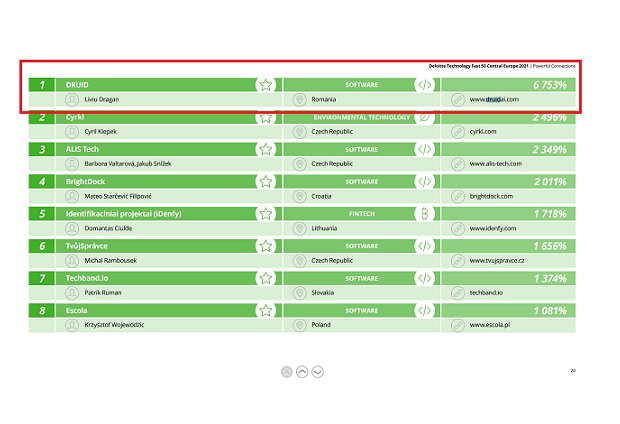 Din categoria „Growth Stars”, ce reunește companii care au înregistrat cea mai rapidă dezvoltare între 2018 – 2020 și în care se încadrează 25 de startup-uri, Druid ocupă primul loc, cu o rată de creștere de 6.753%.