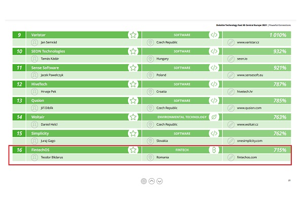 De asemenea, FintechOS, startup-ul românesc care creează soluții digitale pentru industria serviciilor financiare, face parte din companiile cu cea mai rapidă dezvoltare din regiune și se clasează pe locul 16 în categoria „Growth Stars”, cu o rată de creștere de 715%.