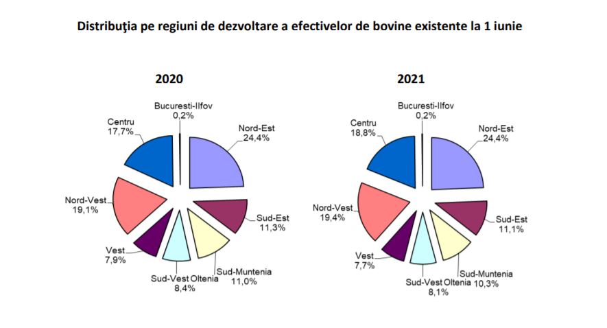 Analizând distribuţia pe regiuni de dezvoltare se constată că ponderea efectivelor de bovine existente la 1 iunie 2021, faţă de aceeaşi dată a anului 2020, a crescut în regiunile Centru (+1,1 puncte procentuale) şi Nord-Vest (+0,3 pp.), a scăzut în regiunile Sud Muntenia (-0,7 pp.), Sud-Vest Oltenia (-0,3 pp.), Sud-Est (-0,2 pp.) şi Vest (-0,2 pp.), iar în regiunile Nord-Est şi Bucureşti-Ilfov a rămas constantă.
