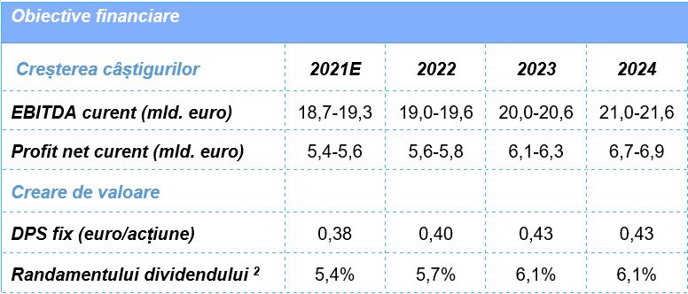În 2024, EBITDA curent al Grupului este așteptat să ajungă la 21,0 – 21,6 miliarde de euro, față de valoarea estimată în 2021, de 18,7 – 19,3 miliarde de euro. Profitul curent net al Grupului este așteptat să crească la 6,7 – 6,9 miliarde de euro în 2024, față de nivelul prevăzut în 2021, de 5,4 – 5,6 miliarde de euro.