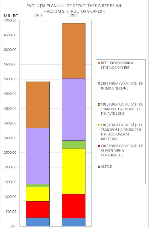 Din graficul alăturat puteți vedea ponderea necesarului de investiții pentru fiecare destinație, așa cum este el estimat acum, comparativ cu estimarea din 2020. După cum se vede, creșterea necesarului de investiții este generată de necesitatea de a se putea evacua mai multă energie din Dobrogea și din sudul Moldovei, zonele vizate de investitori în acest al doilea val al regenerabilelor care se prefigurează.