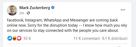 UPDATE 3. Marți în jurul orei 2.00, Mark Zuckerberg a anunțat pe rețea că „Facebook, WhatsApp, Messenger și Instagram revin online acum. Ne cerem scuze pentru întreruperea de azi – Știu cât de mult vă bazați pe serviciile noastre să păstrați legătura cu cei dragi”. Mesajul șefului Facebook poate fi pus și în contextul acuzațiilor făcute de o fostă angajată, potrivit cărora compania ar fi pus traficul și profitul înaintea rolului său social. De la ora 2.10 am putut posta pe pagina de Facebook a StartupCafe.ro.