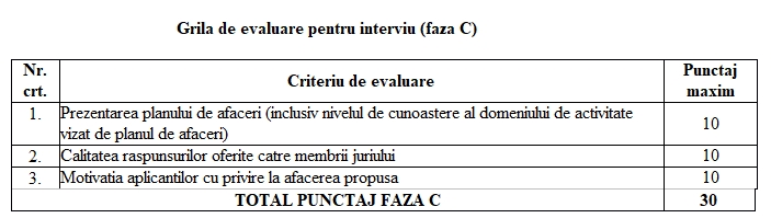 Departajarea aplicațiilor se va realiza printr-un proces de selecție, structurat în trei etape distincte, principalul element de diferențiere a aplicațiilor primite fiind calitatea lor și implicarea asociaților în dezvoltarea respectivei afaceri. Concret, selecția aplicațiilor finanțate se va realiza în urma verificărilor administrative și de eligibilitate (faza A), a evaluarii tehnico-financiare (faza B, conform grilei de evaluare aflate la finalul acestei scheme de minimis) și a fazei de interviuri/pitch (faza C). În faza C a evaluarii vor participa doar primele 250 de aplicații selectate în urma ordonării din faza B a procesului de evaluare.