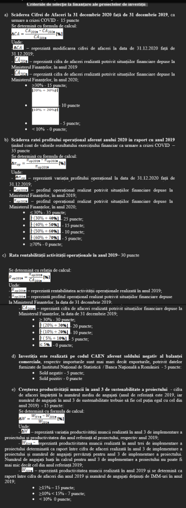 - În schimb, vor fi favorizate la punctaj firmele care au avut scădere a cifrei de afaceri și a profitului în anul 2020 față de 2019. Acest criteriu a fost introdus pentru a se încadra la facilitatea europeană React EU, care finanțează companii afectate de criza COVID-19.