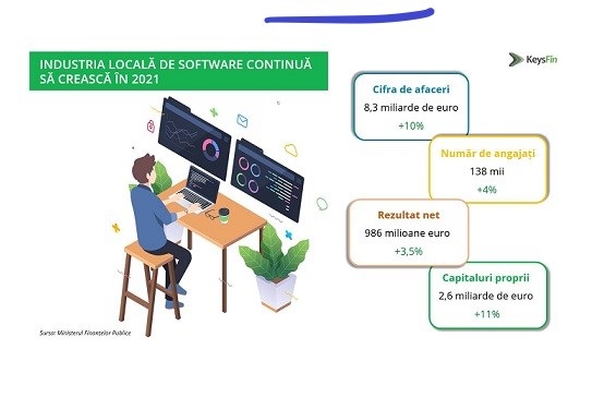 Industria de software din România a crescut cu aproape 10% față de 2019 și a fost cu 250% peste nivelul din 2010, depășind pragul de 8,3 miliarde de euro în 2020, potrivit datelor de la Ministerul Finanțelor, citate de Keysfin.