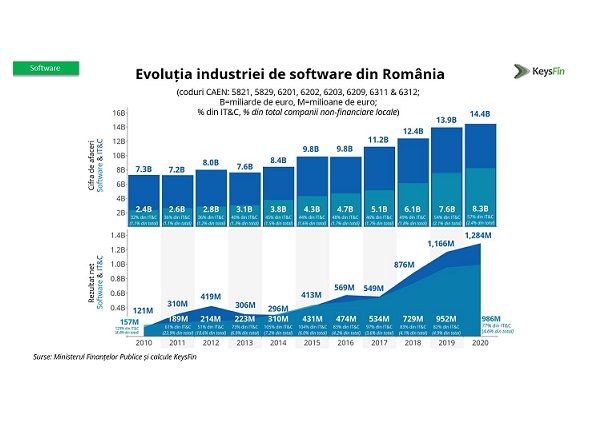 La nivelul cifrei de afaceri totale generate de companiile non-financiare din România ponderea industriei de software a crescut de la 1,1% în 2010, la peste 2,4% din total în 2020.