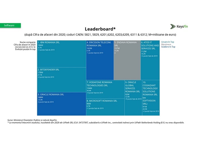 „La momentul întocmirii studiului, rezultatele din 2020 ale UiPath SRL (CUI: 34737997, subsidiară a UiPath Inc., controlată indirect prin UiPath Netherlands Holding B.V.) nu erau disponibile. Compania era pe locul 6 după Cifra de afaceri în 2019, iar pentru 2020, în baza datelor raportate de UiPath, Inc. estimăm o urcare în Top 10 și nu excludem depășirea pragului de 200 milioane de euro, ceea ce înseamnă că UiPath ar putea deveni noul lider al pieței locale de software după cifra de afaceri”, a spus Diana Florescu, analist economic KeysFin.