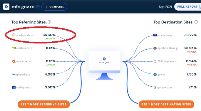 4,54% din vizitatorii de pe desktop au venit pe portalul MIPE accesând link-uri postate pe alte site-uri (referrals). 66% din vizitele provenind din referrals pe mfe.gov.ro au provenit de le StartupCafe.ro, publicația noastră de antreprenoriat fiind pe primul loc în topul site-urilor care au trimis vizitatori pe platforma MIPE (pe desktop).