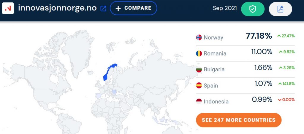 Majoritatea vizitatorilor (77%) provin din Norvegia, cum este și normal, pentru că este vorba despre site-ul unei instituții norvegiene. Interesant este însă că pe locul al doilea sunt viziatorii din România. 11% dintre vizitele făcute pe innovasjonnorge.no în septembrie au venit din România, potrivit datelor Similar Web pentru dispozitivele desktop.
