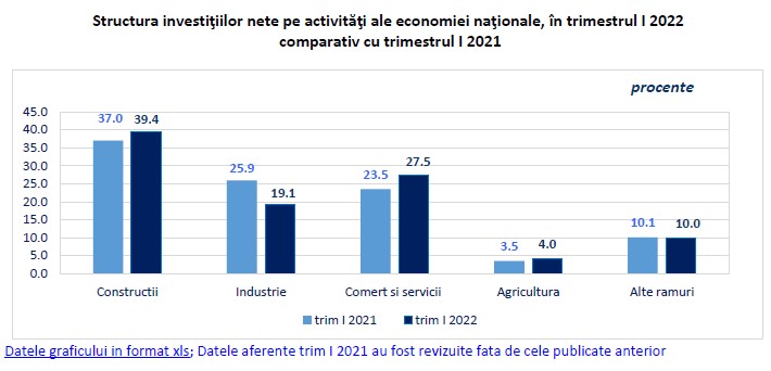 În primul trimestru al anului, investiţiile nete realizate în economia naţională au însumat 24416,8 milioane lei, în creștere cu 1,2%, comparativ cu trimestrul I 2021, potrivit unui comunicat al Institutului Național de Statistică.  Cele mai dinamice sectoare au fost construcțiile, unde creșterea a fost de 4,5% și cel al utilajelor (inclusiv mijloace de transport) cu 0,3%. Scădere s-a înregistrat la alte cheltuieli cu 14%.