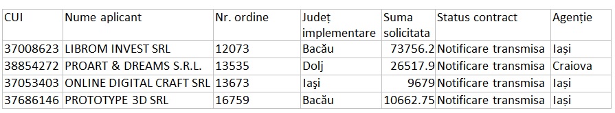 În acest moment, mai sunt 4 firme care figurează cu notificări de contractare primite. Valoarea totală a granturilor solicitate de acestea este foarte mică: 120.000 de lei (circa 25.000 de euro). Aceste firme au la dispoziție 20 de zile de la primirea contractului în sistemul electronic de granturi să semneze contractul și să-ș încarce înapoi în sistem împreună cu dovada cofinanțării. În caz contrar, ele vor pierde ajutoarele de stat.