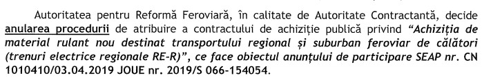În august 2021, ARF a decis anularea licitației pentru cele 40 de trenuri regionale. Reprezentanții ARF susțineau că nu se poate face evaluarea ofertelor cu luarea în considerare a consumului de energie stabilit fără a li se permite ofertanților să-și modifice ofertele, potrivit procesului verbal de anulare a procedurii (foto jos), încheiat pe data de 20 august 2021.