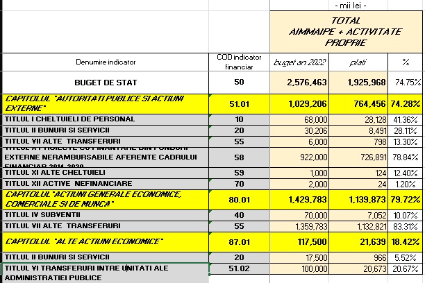 Execuția bugetară a Ministerului Antreprenoriatului și Turismului în primele 5 luni ale anului 2022 a fost de 74,75%, procent raportat la totalul creditelor bugetare acordate instituției pentru anul 2022, în valoare de 2.576.463.000 lei. Plățile efectuate în această perioadă însumează 1.925.968.000 lei.