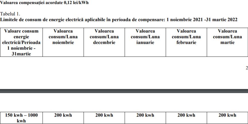 Astfel, energia electrică a fost stabilit un prag lunar de consum de 200 kWh. La gaze au fost stabilite praguri diferite, lună de lună – care nu sunt egale de la o lună la alta, evident, din morive legate de temperaturile diferite din lunile în care se va face compensarea.