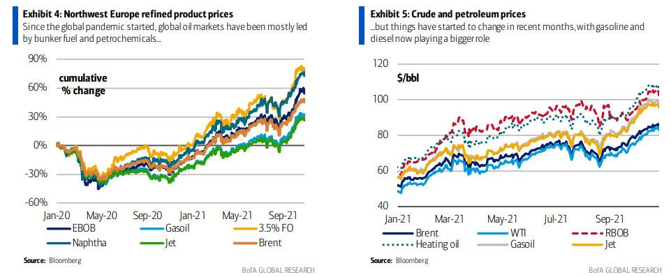 Motivul pentru prognoza BofA privind creșterea prețurilor este același care a determinat orice altă bancă să aibă o perspectivă de creștere a prețurilor mărfurilor – criza energetică globală, care a generat creșterea vertiginoasă a prețurilor țițeiului, cărbunelui, gazelor naturale și GNL, pe măsură ce diferența între prețurile cererii și ofertei scade, ceea ce, la rândul său, provoacă o substituire majoră a consumului de gaz cu cel de produse din petrol. Creșterea călătoriilor cu avionul contribuie de asemenea la avansul prețurilor.