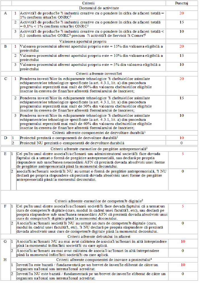 Grila de punctaj propusă de MAT în urma consultărilor publice favorizează firmele cu activități de producție și industrii creative, firmele care pun cofinanțare proprie mai mare de 15% din cheltuielile eligibile, antreprenorii debutanți și antreprenorii care au făcut cursuri antreprenoriale și IT, pecum și proiectele care cuprind investiții prietenoase cu mediul.