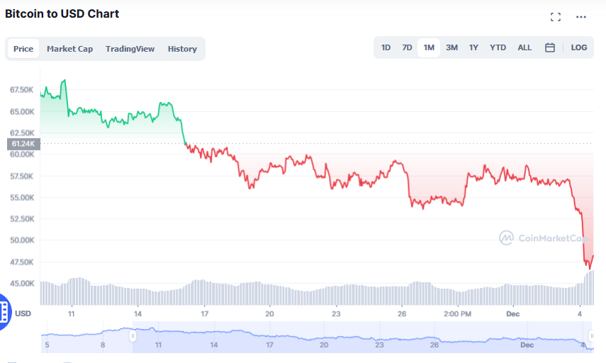 Prețul Bitcoin a picat sâmbătă, 4 decembrie 2021, la un minim al ultimei luni, scăderea fiind de 38% comparativ cu nivelul maxim istoric înregistrat pe 10 noiembrie 2021.