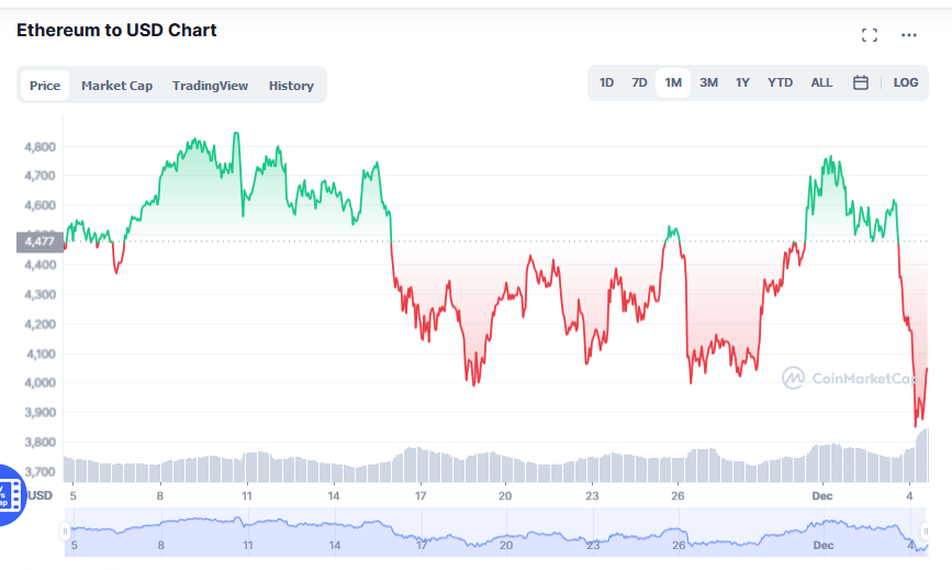 Și ethereum a picat brusc sâmbătă dimineața, până la un preț minim de 3.525 de dolari și 49 de cenți – o cădere cu aproape 28% față de nivelul maxim din ultimele 30 de zile, de 4.891 dolari și 70 de cenți. Sâmbătă, spre seară, și ETH își mai revenea, tranzacționându-se la 4.022 dolari la ora publicării acestei știri. În cursul zilei de sâmbătă, variația criptomonedei ether a fost și de circa 20% (de la prețul minim la maxim al zilei).