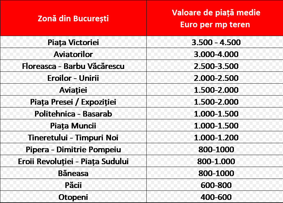 Din analiza prețurilor terenurilor, în cele mai cerute zone de dezvoltare pe piața rezidențială, au rezultat valori între 400 și 800 Euro, la periferie (Otopeni, Păcii), și 3.500 – 4.500 Euro pentru mp de teren în centrul Capitalei (Piața Victoriei și Aviatorilor).