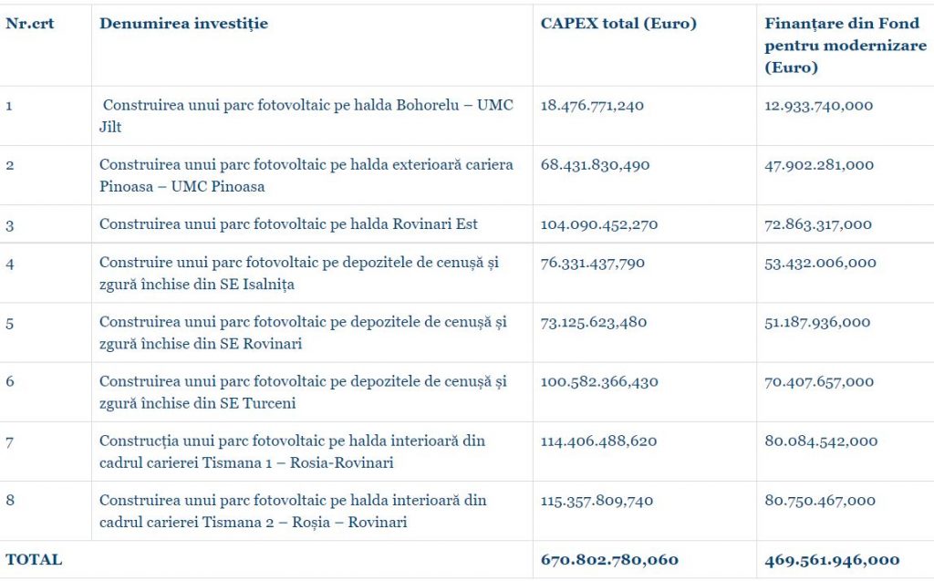 8 proiecte aparținând beneficiarului Complexul Energetic Oltenia, CAPEX total (fără TVA) 670.802.780 euro, după cum urmează: