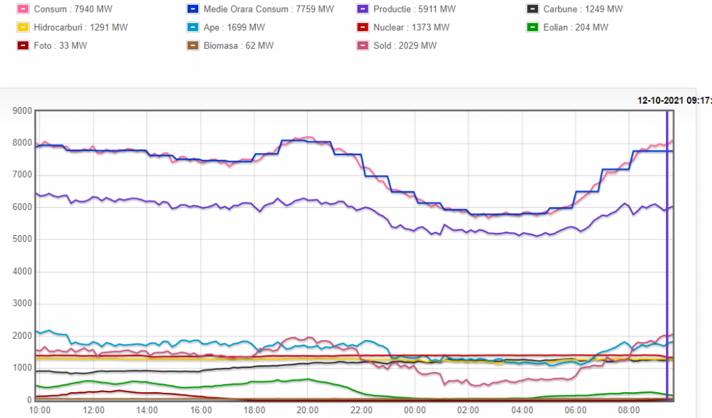 La ora 09.17 în această dimineață, pe fondul unui consum în creștere, dar nu extraordinar – puțin sub 8.000 MW, producția națională de energie electrică era de sub 6.000 MW, ca atare importurile de energie electrică ale țării depășeau valoarea de 2.000 MW.