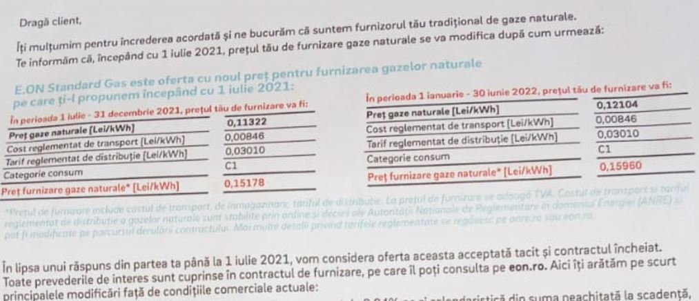E.On a trimis atunci acestor clienți oferta Standard Gas. Ceea ce înseamnă că, în perioada 1 iulie 2021-31 decembrie 2021 vor plăti un preț final de 151,8 lei/MWh, fără TVA, iar în perioada 1 ianuarie 2022-30 iunie 2022 prețul crește la 159,6 lei/MWh, fără TVA. Iată prevederea din notificarea de atunci: