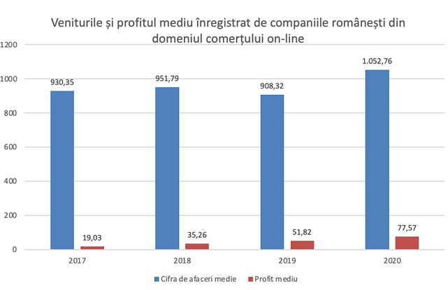 Dacă restrângem analiza la nivelul mediu al domeniului, rezultă că o companie din comerțul online a obținut în anul 2020 profituri în valoare de 77 mii lei, de peste patru ori mai ridicate comparativ cu una care a activat în anul 2017 în același domeniu, când în medie se obțineau profituri de doar 19 mii lei. În anul 2018, în medie, o companie obținea profit de 35 mii lei, pe când în anul 2019 acesta era de aproximativ 52 mii lei.
