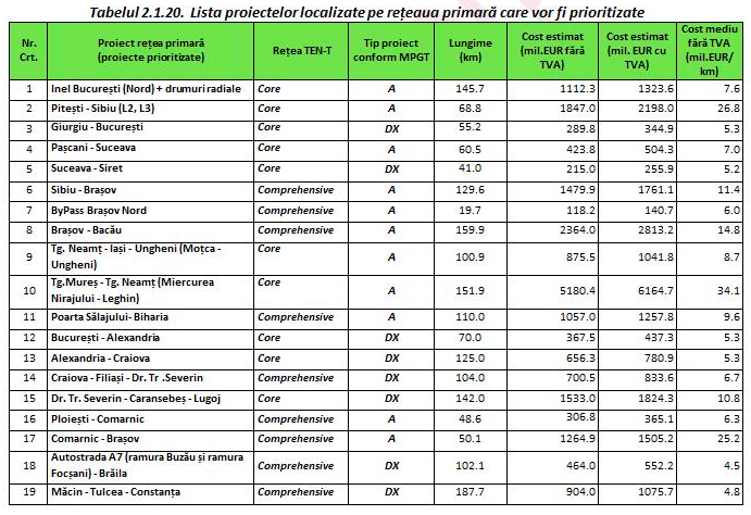 Per total, nevoia de finanţare pentru toate sectoarele de transport din România pe următoarea decadă este de 72,77 miliarde de euro. Din această sumă, 34,19 miliarde de euro sunt dedicate infrastructurii rutiere, 20,63 miliarde de euro infrastructurii feroviare, 10,7 miliarde de euro dedicate infrastructurii de metrou, 4,46 miliarde de euro dedicate infrastructurii navale şi 2,79 miliarde de euro dedicate infrastructurii aeroportuare.