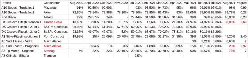 Șantierele pe care au fost raportate cele mai mari progrese în ultima lună sunt Tg Mureș – Ungheni (A3), Vidra – Bragadiru (A0) și tronsonul 1 din Drumul Expres Craiova Pitești (DX12). Clasamentul nu include și șantierele grupului UMB, pentru că în cazul lor nu au fost publicate cifre noi privind stadiul fizic al lucrărilor.